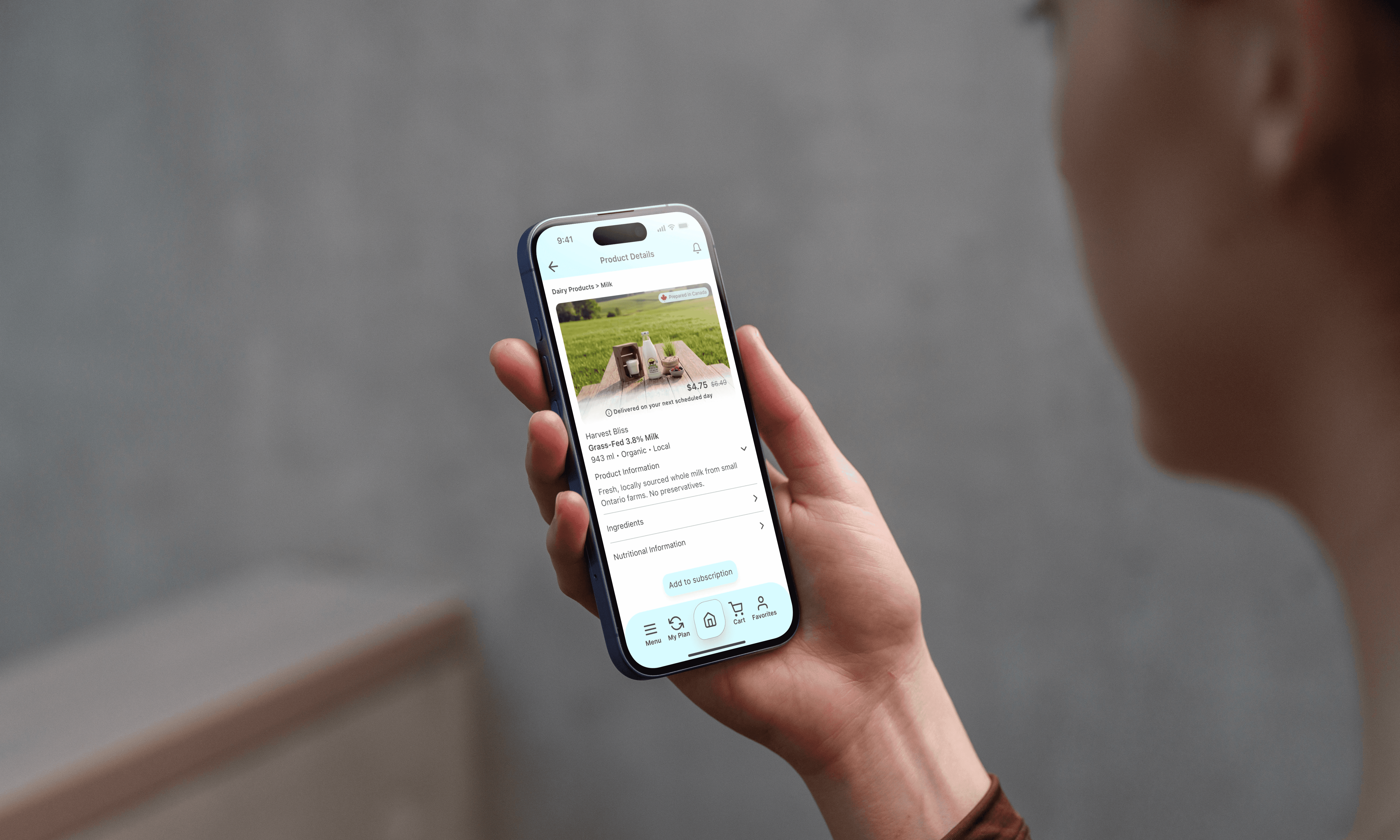 A user-friendly mobile app designed for a dairy company offering sustainable, subscription-based delivery of dairy and non-dairy products.